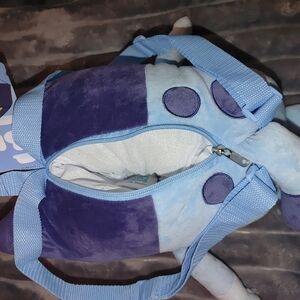 Adorable Bluey plush backpack in vibrant blue and purple. Perfect for young fans to carry their essentials in style. Has adjustable straps. AB2
