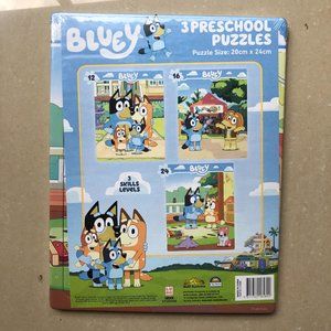 This gorgeous 3 pack of Bluey Preschool Puzzles will delight any little Bluey fan. With large sized pieces ideal for small hands, the 3 puzzles come in a 12, 16 & 24 piece puzzle count to suit different skill levels. Each puzzle measures 20cm x 24cm. Suitable for ages 3 and up.