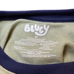 Keywords: Bluey sweatshirt, toddler boy clothes, graphic sweatshirt, long sleeve shirt, cartoon character, kids clothing, 5T, boys sweatshirt, bluey shirt, green sweatshirt, navy sleeves, crewneck, childrens wear