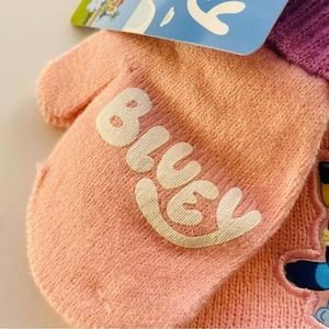 The hat has a patch embroidered on the front featuring Bluey and Bingo and the mittens have the Bluey logo on the top.