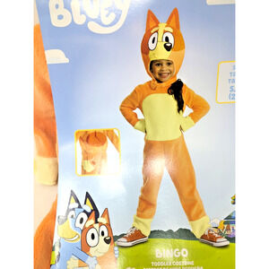 The Bluey Toddlers Bingo Halloween Costume Cosplay in size Small (2T) is a brand-new outfit from Target that is perfect for young children who love the Halloween theme. This unisex complete outfit features a colorful design inspired by the popular children's TV show Bluey, making it a fun and playful choice for little ones to wear during Halloween or dress-up playtime. With its small size and cute details, this costume is sure to bring joy to any toddler ready to celebrate the Halloween season.