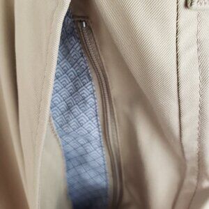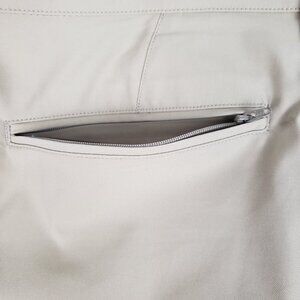 Classic chino pants with front zipper fly and button closure. Easy care, machine washable, wrinkle resistant fabric. Quick dry with anti-odor properties. Stretch waistband with belt loops. 10 total pockets, including 2 phone pockets, 3 zippered pockets, and EDC-friendly multi-tool utility pocket. Gusseted crotch.