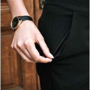 These Bluffworks Trevi Pants in navy blue are a polished yet functional wardrobe staple. Designed with a total of 8 pockets (including 3 with zippers), they blend utility with style. The easy-care stretch fabric is travel-ready and wrinkle-resistant. Adjustable snap hems let you customize the inseam, while the waistband offers comfort for all-day wear. Size 10.