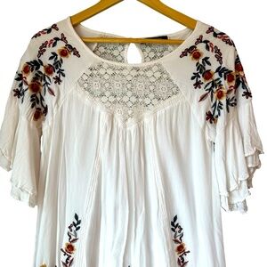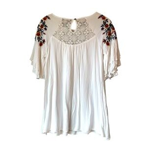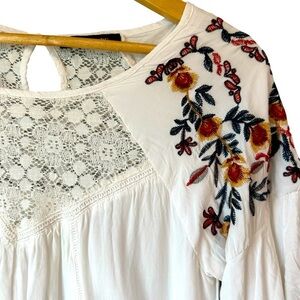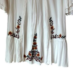 Flowy white top with intricate floral embroidery. Perfect for a stylish and comfortable look.