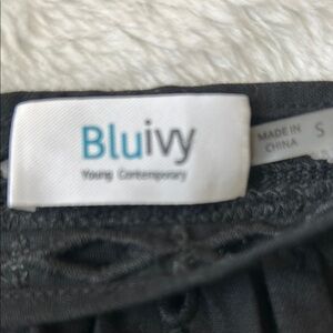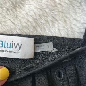This elegant black crop top by Bluivy showcases a sleeveless design with a ruffled neckline, perfect for a chic and breezy look. Crafted from lightweight fabric, it features straps for a personalized fit and a decorative scalloped hem for added flair. Ideal for warm weather, this top effortlessly combines style and comfort.