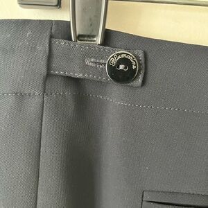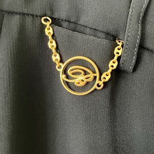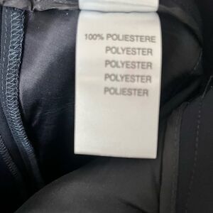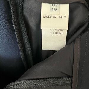 Made in Italy of 100% polyester. Lightweigh fabric. Flat front, belt loops at waist, side and back slit pockets. Zips up the front. Very good condition. Hammered brass button, brass chain with rhinestones. No holes, stains or snags. Stored in a smoke-free home.