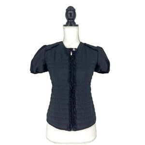 This chic and feminine Blugirl Blumarine short sleeve jacket adds a playful yet polished touch to any wardrobe. Crafted in Italy from lightweight black polyester, it features ruffled detailing, elasticized puff sleeves, and a zip front with a snap closure at the neck. Zippered hip pockets offer both function and flair, while the short silhouette makes it perfect for layering over dresses or pairing with high-waisted jeans. A versatile piece with unmistakable European charm.