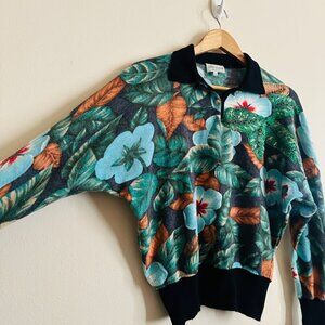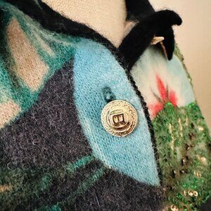 This Blumarine sweater features a vibrant floral pattern with sequined accents, crafted from a luxurious blend of angora and wool. The black collar and button closure add sophistication, while the rich colors elevate any wardrobe. Ideal for those seeking unique vintage pieces with a touch of elegance.