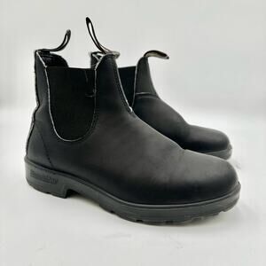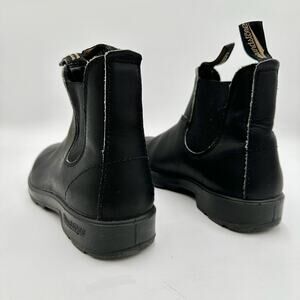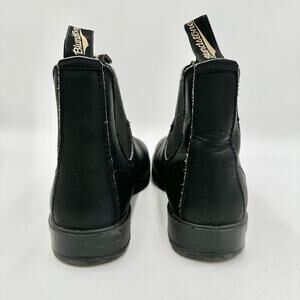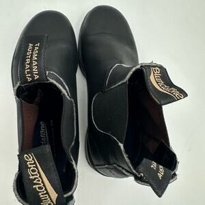 Classic black Blundstone ankle boots. Durable leather construction. Slip-on style with elastic side panels.