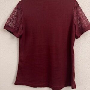 Beautiful burgundy blouse with a soft waffle-knit texture and delicate geometric lace sleeves. Feminine, classy, and easy to style for work, casual outings, or dressed-up looks. Features decorative pleats on the front that create a flattering silhouette. Lightweight, comfortable fabric. Excellent condition, no flaws.