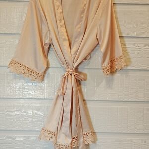 Blush Baby Light Pink Satin 3/4 length sleeve Robe Womens Crochet Trim Feminine