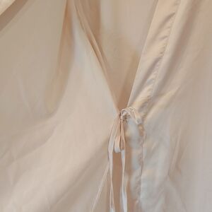 Beautiful satin robe light pink. I super tiny stain and a small run. Both are shown in the pictures. There is no tags but I would say it could fit a range of L-XXL