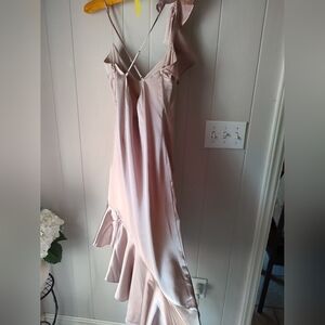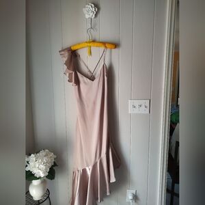 Step into effortless elegance with this new with tags satin cocktail dress. In a romantic blush tone, this dress features a sleek silhouette with an asymmetrical ruffled hem and a flirty one-shoulder strap detail. The cross-back spaghetti straps add a modern touch, while the soft satin fabric drapes beautifully for movement and shine. Perfect for weddings, cocktail parties, date nights, or any occasion where you want to turn heads.