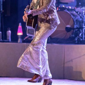 Statement Party Pants! ✨ These super wide leg bell bottom sequin pants are so fun and flattering! They do not have a lining and are relatively sheer, as seen in the photo of the bottom hem. Layered with neutral leggings underneath they are perfect. They also feature a small elastic section on the back of the waistband. Worn at the Beacon Theatre in New York City.