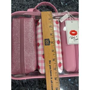 Brand new Blush Crush vegan accessories set featuring three coordinating cosmetic bags inside a clear pink carrying case. Includes one glitter pink pouch, one pink gingham strawberry print pouch, and one solid pink pouch. Perfect for travel, makeup storage, or gifting.