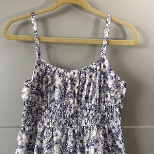 White and purple floral print sundress with smocked bodice and ruffle tiered skirt
