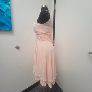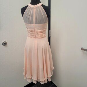 Beautiful hi-lo chiffon dress with a halter heck in Blush. Pleated waist. Back zip. Lined. Polyester.