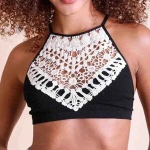 The high neck crochet bralette has a fun, flirty vibe that will have you dancing the night away. The intricate lace adds a touch of elegance while, the high neck gives you a little extra coverage. Whether you're hitting the beach or exploring a new city, this bralette is a must-have for your vacation wardrobe!