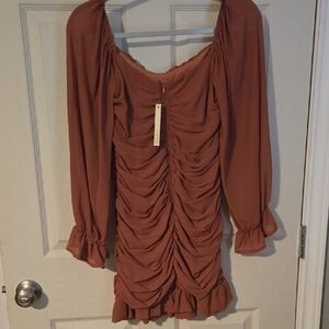 Chic long sleeve dress with ruched front. Stylish and versatile for any event.