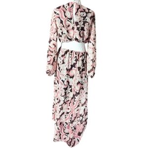 Blush Maxi Dress XL Boho Swirl Peach and Brown I Ring Cutout Hippie V Neck Sexy