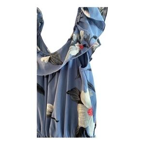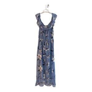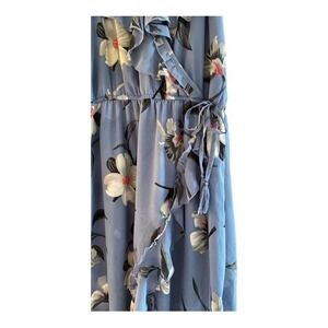 Maxi dress by Hint of Blush. Perfect for a Cruise or special vacation. Great dress to tuck in your suitcase for travel. Shorter front. Ruffles on the neck, down front, and hem. Gorgeous dusty blue modern floral. Elastic waist with surplice front. Lined. Very comfortable and chic dress. Excellent Preowned Condition. Size Large