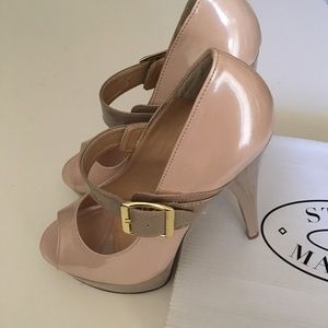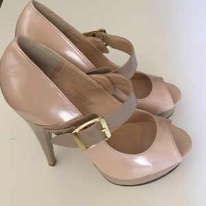 Cute patent blush platforms heel, front strap and platform contrast. Peep toe
