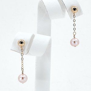Timeless and elegant pink pearl drop earrings feature blush pink freshwater pearls hanging from dainty gold filled chains. Each pair exudes timeless elegance and feminine charm, perfect for adding a touch of sophistication to any outfit.