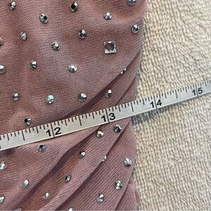 • Details: Soft blush pink color, all-over sparkling rhinestones, asymmetric one-shoulder design, and draped ruching for a flattering silhouette