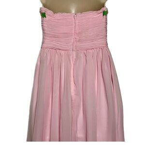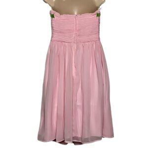 This comfortable and beautiful dress features a Sweetheart neckline, strapless, & knee length. Bra like strap in the back for extra support, boning around torso, rubber like piping on inside of top to help keep it up and yes it has pockets.
