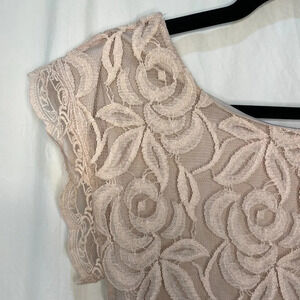 Beautiful dress that is comfy too! Fully lined. Blush lace overlay. Cap sleeves with lace edging.