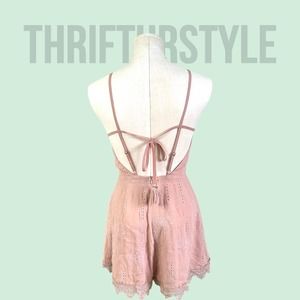 Keywords: romper, blush pink, lace trim, spaghetti strap, halter top, open back, casual, cute, summer, festival, eyelet, tie back, one piece