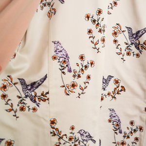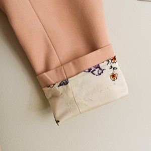 Love this casual blazer in a beautiful neutral blush pink with delicate floral lining—perfect for Spring and Summer! I love it over dresses to give them a more professional, polished look—plus functioning pockets for business cards! It's a size medium but runs large, giving it a nice oversized feel, but still tapered enough that it isn't shapeless. It's in great condition except there are some pulls on the lining fabric at the left wrist from my watch (pictured), hence the low price.