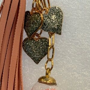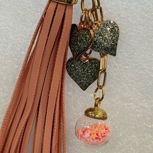 Blush Pink Tassel Keychain w/Glitter Hearts & Sprinkle Globe Charm -New -Unique