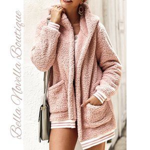 Blush Pink Teddy Fleece Sherpa Varsity Hoodie Jacket with Pockets