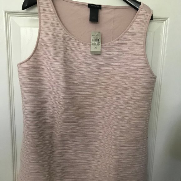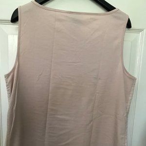 Blush pink, horizontal texture in the front, plain knit in back, round neck, sleeveless. Great piece under a jacket or cardigan or by itself!