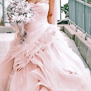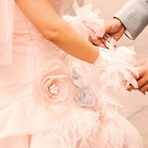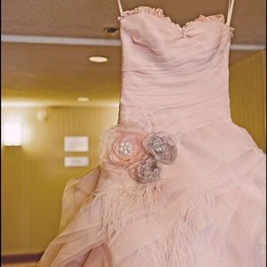 This custom gown was embellished by myself. The handmade organza flowers, beaded with pearls and rhinestone brooches. Accented with Blush ostrich feathers to give the gown a couture look. If you have any questions, please inquire.