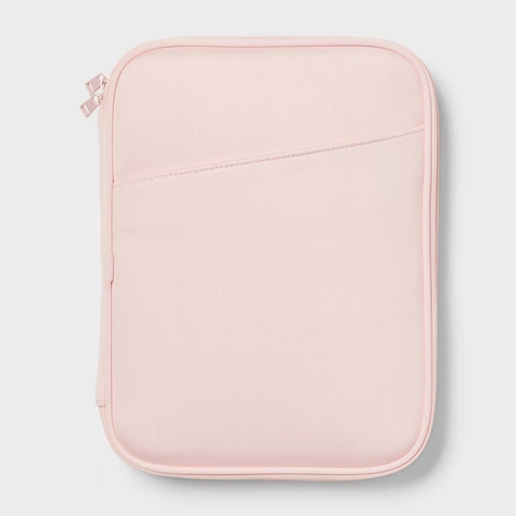 Keep your tablet or laptop secure in style. This light blush pink pouch features multiple pockets for your tech accessories and a smooth zip closure to protect your device on the go.