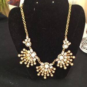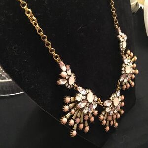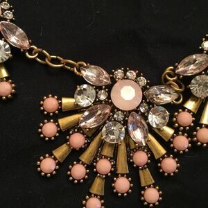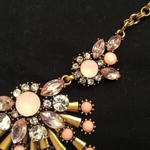 These beautiful acrylic stones in blush, pink and clear crystals are bezel set in goldtone metal. The pattern reminds me of a scallop shell. Great goldtone link with lobster claw clasp. Necklace measures 16” on inside length and extend adds up to another 2”. Gorgeous statement piece that screams “look at me!”