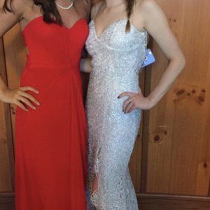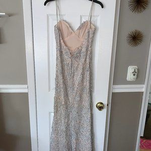 This beautiful princess-looking formal dress is a maxi dress in a blush/ light pink color with silver glitter detail on the outer layer. The dress has a sweetheart neckline with thin spaghetti straps holding the dress up. The zipper comes to the low back. The dress is also styled with a slit that cuts to the mid-thigh. This dress is from B. Darlin and fits a size small. Worn only once.