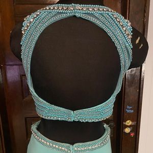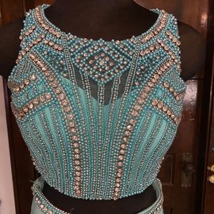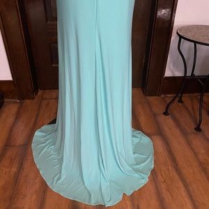 Blush Prom mint green stunner. Rhinestone/beaded bodice with keyhole back. Rhinestone trim on soft jersey skirt with sexy slit.