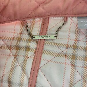 Solid, quilted, blush rose long-sleeve jacket comes with a style surprise: a plaid taupe and blush pattern on the reverse side. Two looks styled in one. cozy and machine washable perfect for the fall.