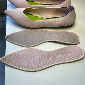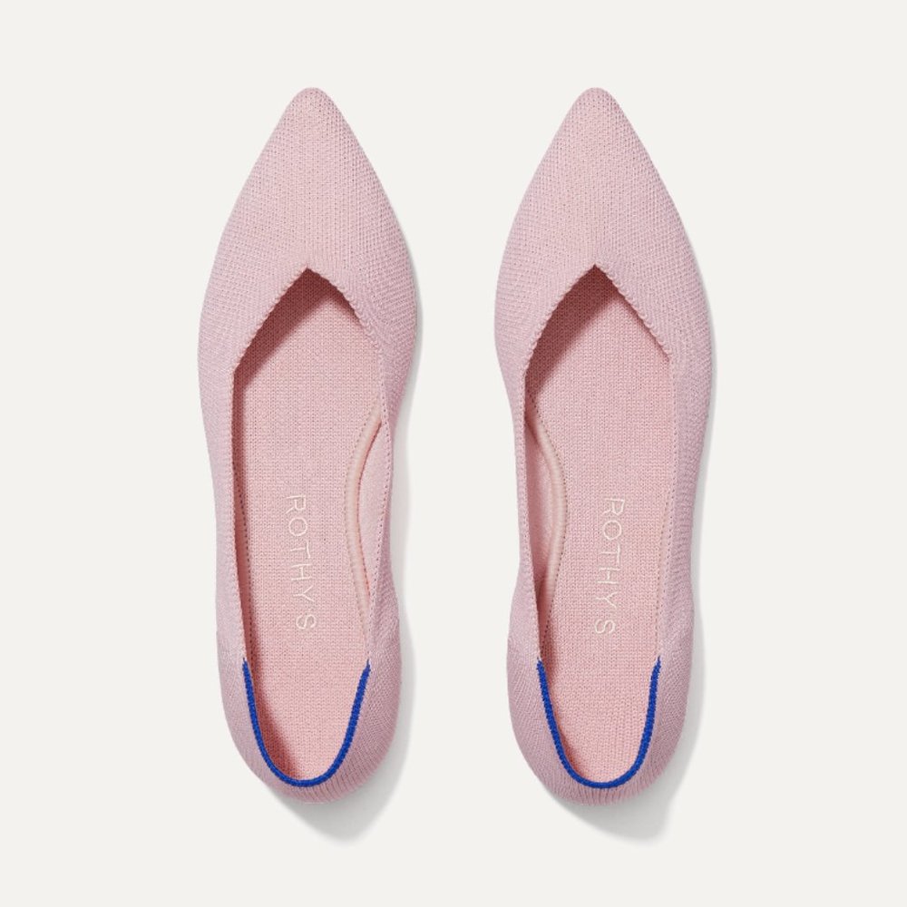 Beautiful pale pink pointed flat. I wore them only a few times before realizing I needed to size up (again). They are no longer available to order on the Rothy's website, they've been discontinued! For some inexplicable reason the right inner sole is grayer than the left and there is wear in the inside heel area.