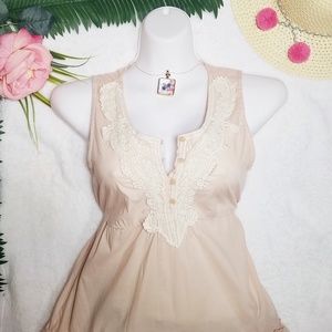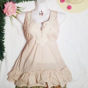 Blush Nude Ruffle Tunic Top. Beautiful muted mauve top, lace accents , dainty buttons, and tie waist to cinch for sizing. Perfect boho spring summer piece.