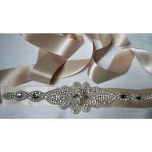 Beautiful blush-vanilla color rhinestone belt. The ribbon is double faced satin 1 1/2 inch wide and 108 inch long. The hand sew on applique is 12 inches long.