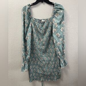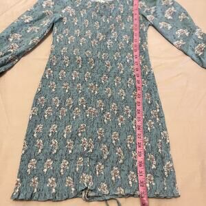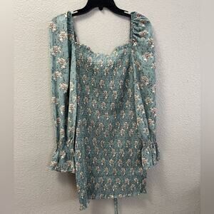 Used, excellent condition. Long, sheer, flowy sleeves. Fully ruched body for flattering fit. String down the center can be adjusted as you desire for a shorter look. Beautiful allover floral pattern. Approximate measurements shown in photos.