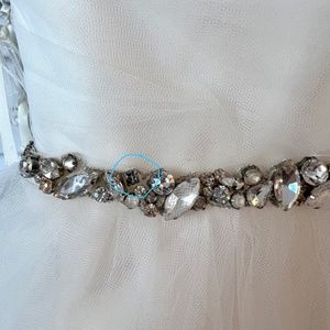 See circled parts- one small rhinestone missing in the front but not noticeable. Left side of the back one part of the tulle is damaged.