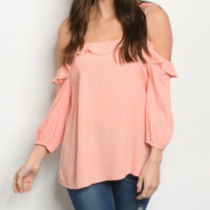 Blush cold shoulder top with ruffles. This top is super cute with a relaxed fit.