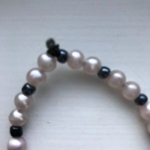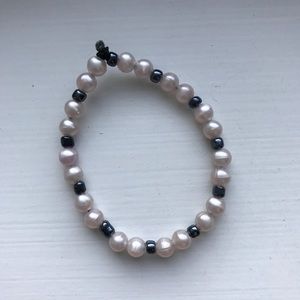 Blush pink, pearl-like and charcoal gray / monochrome / gunmetal beaded bracelet. This bracelet is set on an elastic, so it can stretch to fit most wrist sizes - though it would probably fit those with smaller wrists best. A versatile piece of jewelry that can be worn alone or stacked with other bracelets and bangles!