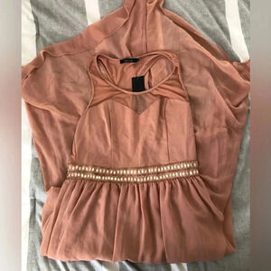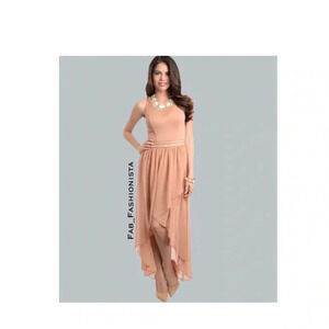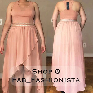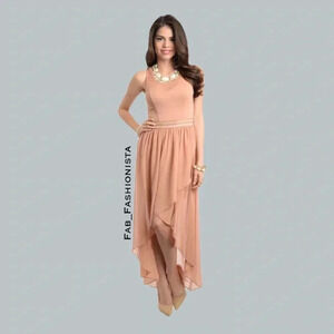 Gorgeous dress, soft chiffon sleeveless dress features a sheer neck yoke and racer back. Embellished waist band with tulip style hi-low skirt.
