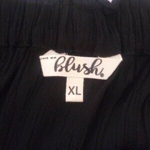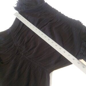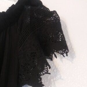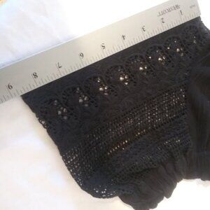 Touch of Blush black jumpsuit, crochet short sleeves, elastic waist, tie front, elastic neckline, off the shoulder